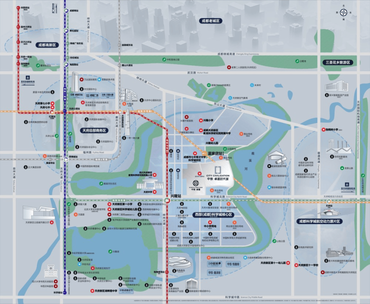 根据《成都市国土空间总体规划(2021-2035年)》最新批复,兴隆湖片区与天府商务区共同构成"天府新中心"双核格局。中铁卓著雄踞科学城核心板块,坐享区域产业升级与配套完善双重红利,已成为成都最具发展潜力的价值高地。