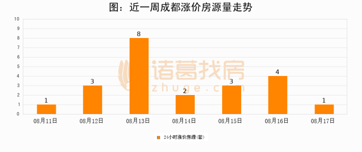 根据诸葛找房数据显示,成都24小时涨价房源量为1套,较08月16日减少3套,环比下降75%。与此同时,涨价房源占比小幅回落,对于购房者来说是一个入市窗口期,购房者可抓住时机入市。