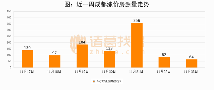 根据诸葛找房数据显示,成都24小时涨价房源量为64套,较11月22日减少18套,环比下降22%。与此同时,涨价房源占比小幅回落,对于购房者来说是一个入市窗口期,购房者可抓住时机入市。