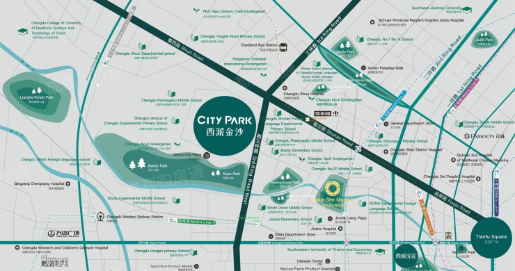 生态:项目占据主城区优势的同时,享有优质的自然景观资源,5个自然生态公园1个体育公园环绕:清水河公园、东坡公园、黄忠公园、金沙滨河公园。项目南侧是成都市政府斥巨资重点规划打造的绕城环城生态上重要一环"1770亩百仁生态公园"相当于5个浣花溪加上3个东湖的大小。