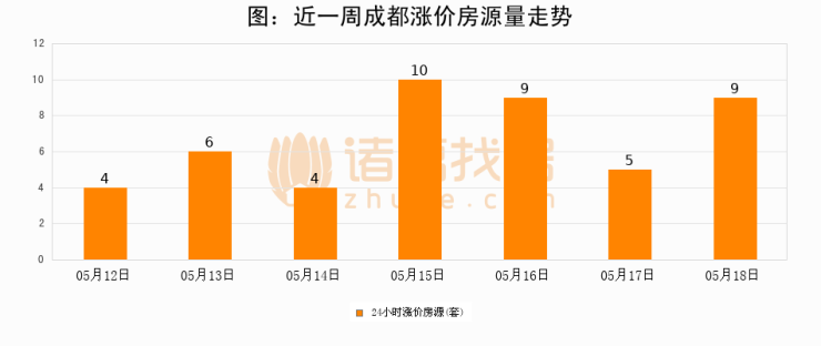 根据诸葛找房数据显示,成都24小时涨价房源量为9套,较05月17日增加4套,环比上涨80%。与此同时,涨价房源占比小幅扩大,业主信心有所提升。