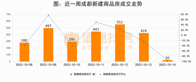 根据成都市住房和城乡建设局数据显示,2023年10月14日成都新建商品房成交20套,较昨日减少404套,环比下降95.3%