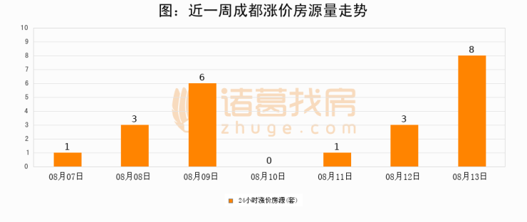 根据诸葛找房数据显示,成都24小时涨价房源量为8套,较08月12日增加5套,环比上涨166.7%。与此同时,涨价房源占比小幅扩大,业主信心有所提升。