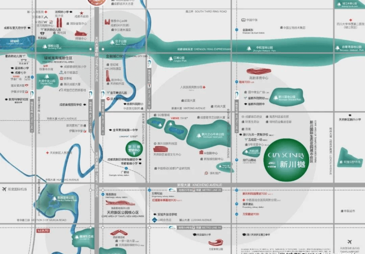 中国铁建·新川樾位于高新南区新川板块。新程大道与新裕南二路交汇处,正属于新川公园辐射半径内和新川创新科技园范围内。新川板块旨为带来更舒适、更便捷的人居环境体验,医疗、教育、生态等配套已逐步呈现,区域价值腾飞。板块平均毛容积率约1.85,低密城市布局,按照产城融合、职住平衡理念,住宅用地仅占18% (约2800亩),板块总规划面积约10.34平方公里,将缔造一座创新、生态、人文高度融合的“世界交融之城”。借监新加坡“园中之城”理念,新川作为高新CBD的活力区域,处于“承高新、启天府”核芯枢纽。