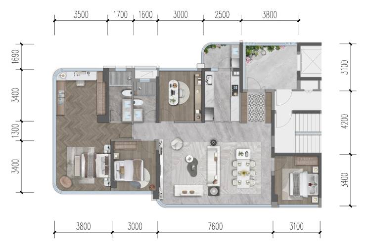 户型分析:楼尊视野 中庭楼王位置,尽享小区最佳中庭景观和超大楼间距,南北朝向,采光通风俱佳· 社交方厅约76㎡LDKB中央社交方厅,满足社交、聚会等场景,开放式中西厨+灵动导台· 越级享受开间超7米,媲美市场上250㎡豪宅尺寸感,超大会客厅尽显豪宅气派· 光厅入户约12㎡光厅入户,独立拼花玄关,双侧收纳空间,满足全家需求· 中西双厨厨房约4.5米超大开间,U型设计,中西厨联动,布局合理,尺度开阔· 星级套房星级双套房设计,洞悉家庭多元所需,约42㎡环幕主卧超大套房,行政级衣帽间尽显尊贵,独立式浴缸礼致峯范人生· 超大空间实际可利用空间约建筑面积的103%