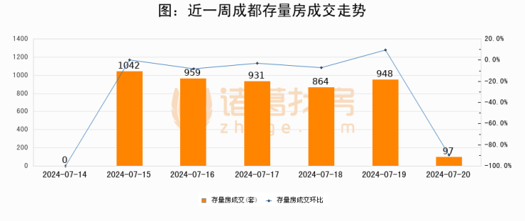 从存量房来看,2024年07月20日成都存量房单日成交97套,比昨日减少851套,环比下降89.8%。从近一周存量房成交来看,成都存量房日均成交套数为691套,07月20日单日成交97套,低于近一周平均水平86%。
