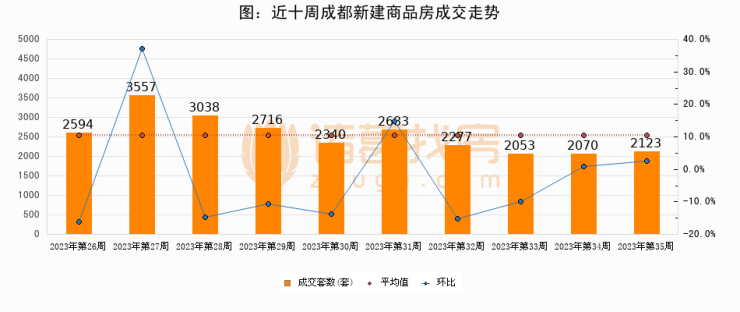 进入2023年第35周(08月21日-08月27日),成都新建商品房成交2123套,较上周增加53套,环比上涨2.6%