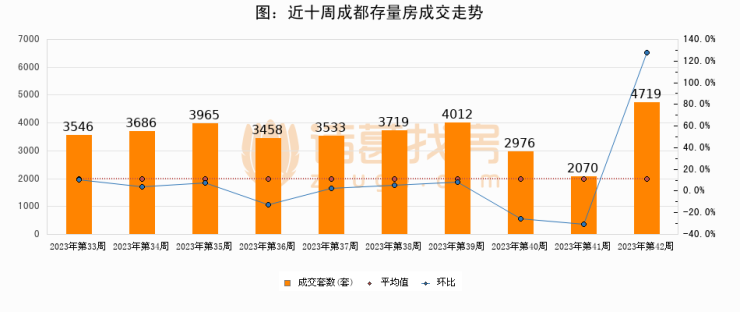 存量房方面,第42周成都存量房成交4719套,较上周增加2649套,环比上涨128%。从近十周成交走势来看,周均成交套数为3568套,本周高于平均水平32.3%。
