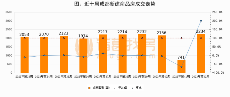 进入2023年第42周(10月09日-10月15日),成都新建商品房成交2234套,较上周增加1493套,环比上涨201.5%