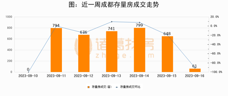 从存量房来看,2023年09月16日成都存量房单日成交61套,比昨日减少587套,环比下降90.6%。从近一周存量房成交来看,成都存量房日均成交套数为531套,09月16日单日成交61套,低于近一周平均水平88.5%。