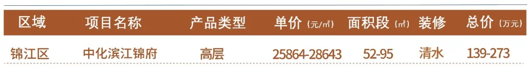 锦江区作为主城公认的深改区域,从新房供应来看,一方面是量少,另一方面是价昂,据成都新楼市统计,10月锦江区新房预售均价在26689-33445元/㎡。中化滨江锦府之所以能将上车门槛控制在300万内,主要得益于其主城内少见的小户型,项目上批次推出93套、建面约52-95㎡清水户型,总价约139-273万。从区位上看,项目位于中环内,毗邻川师大狮子山校区,据百度地图显示,项目距地铁7号线狮子山站直线距离约200米。项目上批次所推户型中,包括建面约52㎡、56㎡、64㎡两室户型,以及建面约72㎡、73㎡、81㎡、85㎡、95㎡三室户型,可选择面较广。