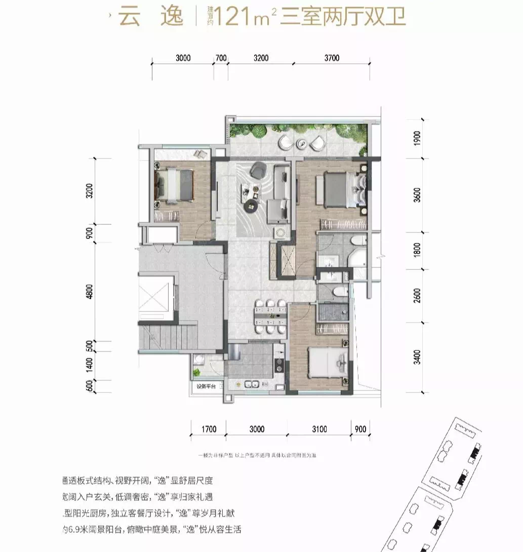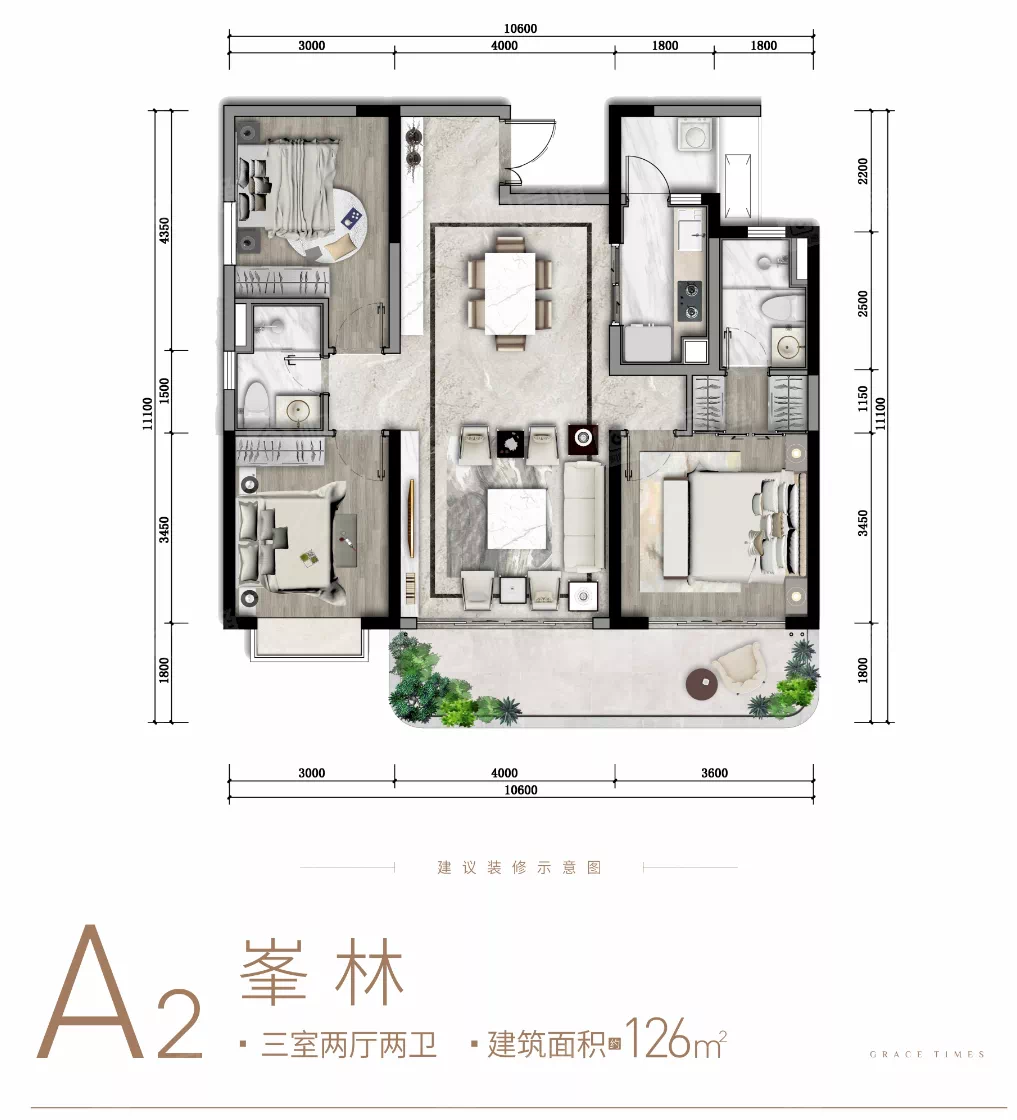 ▷ 国宾上林栖建面约126㎡特别值得一提的是,国宾上林栖项目大多户型都配置了成都人喜爱的大阳台,以建面约126㎡套三双卫户型为例,该户型阳台尺寸达6.7x1.8米,虽然126㎡只做了三个卧室,但三个卧室面积都大于10㎡,舒适性高。