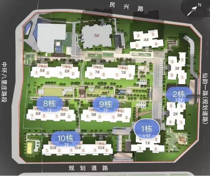 ▷ 首钢璟辰里总平图 其中蓝色楼栋为近期已取证楼栋从位置上看,项目位于东中环,地铁7号线八里庄站就在项目一箭之地,步行可达。户型方面,项目规划有建面约119㎡、139㎡高层,以及建面约143㎡、162㎡、175㎡的洋房户型。