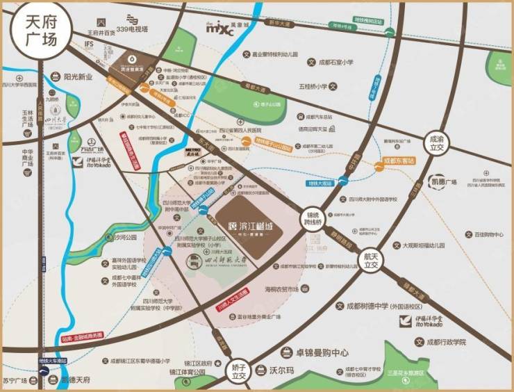 滨江樾城, 位于锦江区中环路锦绣大道段,川师大旁,距离地铁7号线狮子山站约300米。 承袭锦江区的深厚历史底蕴,又能尽享锦江区的区域利好,是主城少有的价值洼地。项目总占地约100亩,共分4个组团进行独立打造,其中B地块为雅致居住区(中化•滨江锦城),C、E地块为纯住宅,包含大平层和别墅,D地块为LOFT、艺术商业街区。