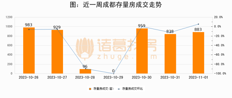 从存量房来看,2023年11月01日成都存量房单日成交883套,比昨日增加45套,环比上涨5.4%。从近一周存量房成交来看,成都存量房日均成交套数为669套,11月01日单日成交883套,高于近一周平均水平32%。