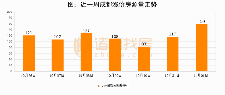根据诸葛找房数据显示,成都24小时涨价房源量为159套,较10月31日增加42套,环比上涨35.9%。与此同时,涨价房源占比小幅扩大,业主信心有所提升。