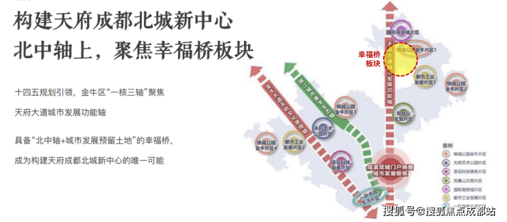 十四五规划引领,金牛区“一核三轴”聚焦天府轨道城市发展功能轴具备“北中轴+城市发展预留用地”的幸福桥,成为构建天府成都北城新中心的唯一可能。