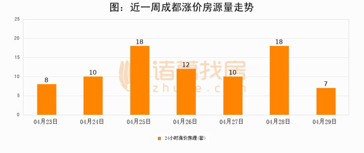 根据诸葛找房数据显示,成都24小时涨价房源量为7套,较04月28日减少11套,环比下降61.1%。与此同时,涨价房源占比小幅回落,对于购房者来说是一个入市窗口期,购房者可抓住时机入市。