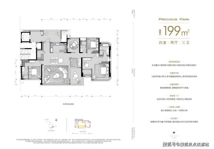 ✅ 建面199㎡四房三卫(高端改善优选):约80㎡全维方厅(含空中庭院),打破横厅、竖厅刻板设计,适配社交宴请、家庭互动等多元场景;约49㎡主卧套间,融合就寝、衣帽间、书房等功能,可实现“4+1”灵活格局。