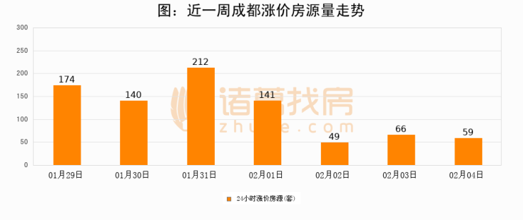 根据诸葛找房数据显示,成都24小时涨价房源量为59套,较02月03日减少7套,环比下降10.6%。与此同时,涨价房源占比小幅回落,对于购房者来说是一个入市窗口期,购房者可抓住时机入市。
