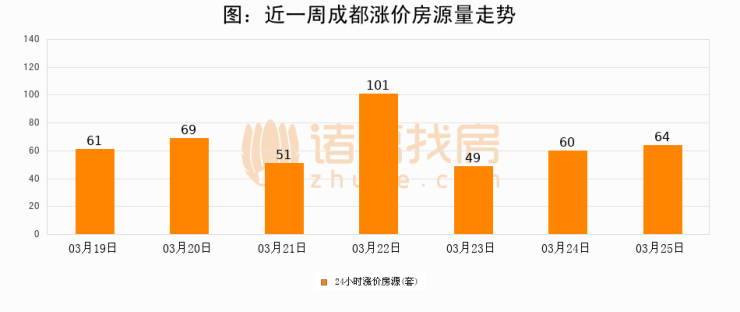 根据诸葛找房数据显示,成都24小时涨价房源量为64套,较03月24日增加4套,环比上涨6.7%。与此同时,涨价房源占比小幅扩大,业主信心有所提升。