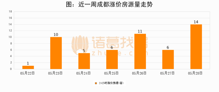 根据诸葛找房数据显示,成都24小时涨价房源量为14套,较05月27日增加8套,环比上涨133.3%。与此同时,涨价房源占比小幅扩大,业主信心有所提升。