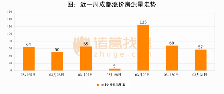 根据诸葛找房数据显示,成都24小时涨价房源量为57套,较03月30日减少11套,环比下降16.2%。与此同时,涨价房源占比小幅回落,对于购房者来说是一个入市窗口期,购房者可抓住时机入市。
