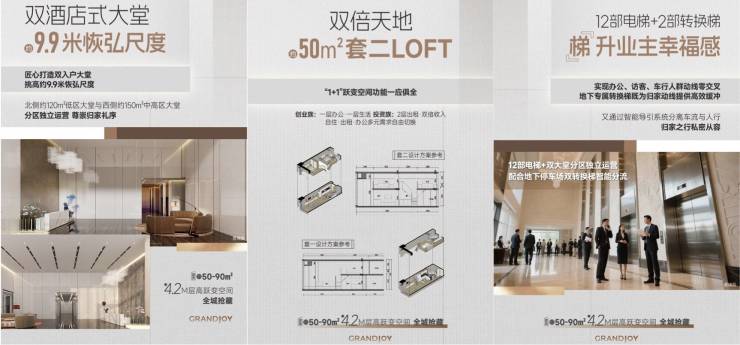 入户大堂:9.9m双入户大堂,北侧低区大堂120㎡,西侧中高区大堂150㎡