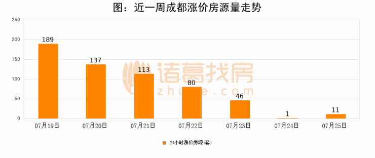 根据诸葛找房数据显示,成都24小时涨价房源量为11套,较07月24日增加10套,环比上涨1000%。与此同时,涨价房源占比小幅扩大,业主信心有所提升。