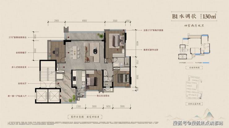 位于项目中轴线上,尽享南北双向中轴景观。拥有最长约 18.4m 阔尺南向面宽,设置南北双观景阳台,视野极为开阔。采用 LDKB 无界待客体系,定制中西双厨的国际化设计,满足多样化烹饪需求。独立餐厅用餐区域,可满足家庭举办宴会等需求,带来墅级居住体验。该户型精装标准全面升级,选用 “gani 简一” 品牌通铺地砖,橱柜由 “博洛尼” 高端系列搭建,卫浴空间洁具由 “杜拉维特”“汉斯格雅” 提供,双台盆以奢石铺就,尽显奢华 。
