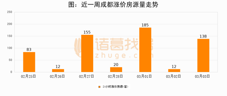 根据诸葛找房数据显示,成都24小时涨价房源量为138套,较03月02日增加126套,环比上涨1050%。与此同时,涨价房源占比小幅扩大,业主信心有所提升。