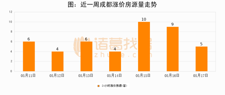 根据诸葛找房数据显示,成都24小时涨价房源量为5套,较05月16日减少4套,环比下降44.4%。与此同时,涨价房源占比小幅回落,对于购房者来说是一个入市窗口期,购房者可抓住时机入市。