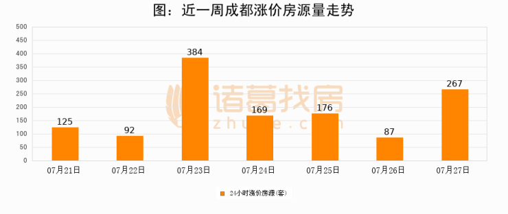 根据诸葛找房数据显示,成都24小时涨价房源量为267套,较07月26日增加180套,环比上涨206.9%。与此同时,涨价房源占比小幅扩大,业主信心有所提升。