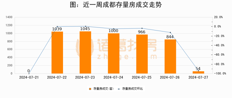 从存量房来看,2024年07月27日成都存量房单日成交54套,比昨日减少790套,环比下降93.6%。从近一周存量房成交来看,成都存量房日均成交套数为706套,07月27日单日成交54套,低于近一周平均水平92.4%。