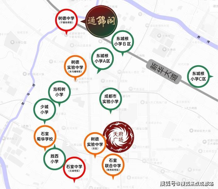 根据学区划片,通锦阁属于青二学区;是少数有机会实现“小学读五朵金花-初中上三小联中-高中进四七九本部” 的优质学区,教育资源密度与质量全市领先。(青羊二区划片范围依据“青羊教育”微信公众号(https://mp.weixin.qq.com/s/Lhp-7Ml4D5VQ-38yLAF0Aw)内对青羊二区所有小学的划片范围及道路名称手绘而成,仅供参考,具体信息应以教育主管部门及学校颁布的政策规定为准。)