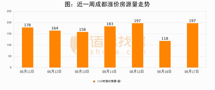 根据诸葛找房数据显示,成都24小时涨价房源量为197套,较08月16日增加79套,环比上涨66.9%。与此同时,涨价房源占比小幅扩大,业主信心有所提升。
