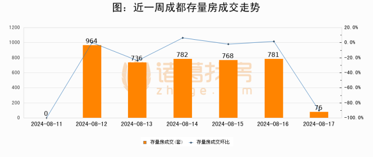 从存量房来看,2024年08月17日成都存量房单日成交76套,比昨日减少705套,环比下降90.3%。从近一周存量房成交来看,成都存量房日均成交套数为586套,08月17日单日成交76套,低于近一周平均水平87%。