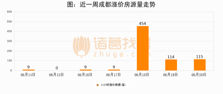 根据诸葛找房数据显示,成都24小时涨价房源量为115套,较06月19日增加1套,环比上涨0.9%。与此同时,涨价房源占比小幅扩大,业主信心有所提升。