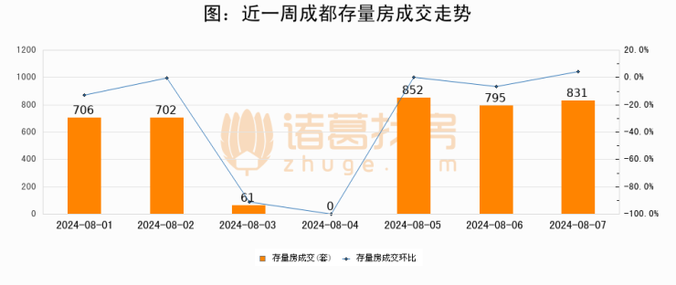 从存量房来看,2024年08月07日成都存量房单日成交831套,比昨日增加36套,环比上涨4.5%。从近一周存量房成交来看,成都存量房日均成交套数为563套,08月07日单日成交831套,高于近一周平均水平47.6%。