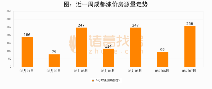 根据诸葛找房数据显示,成都24小时涨价房源量为256套,较08月06日增加164套,环比上涨178.3%。与此同时,涨价房源占比小幅扩大,业主信心有所提升。