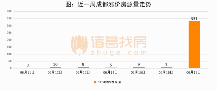 根据诸葛找房数据显示,成都24小时涨价房源量为331套,较06月16日增加324套,环比上涨4628.6%。与此同时,涨价房源占比小幅扩大,业主信心有所提升。