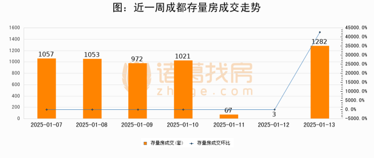 从存量房来看,2025年01月13日成都存量房单日成交1282套,比昨日增加1279套,环比上涨42633.3%。从近一周存量房成交来看,成都存量房日均成交套数为779套,01月13日单日成交1282套,高于近一周平均水平64.6%。
