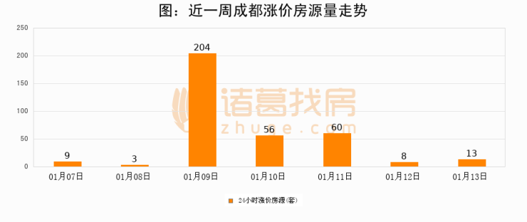 根据诸葛找房数据显示,成都24小时涨价房源量为13套,较01月12日增加5套,环比上涨62.5%。与此同时,涨价房源占比小幅扩大,业主信心有所提升。