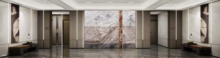 3.地下室大堂:地下室大堂沿用了地面入户大堂一样的标准,同样搭配人脸识别门禁及电动感应入户门。约20㎡的大堂空间,约4.5m层高,户户均配置了仿铜不锈钢+夹丝玻璃车库大门,矗立在暖色大理石墙体之间,处处弥漫着精致感、尊崇感。