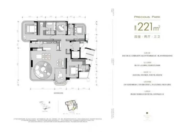 这一户型虽不是传统的方正格局,但创新设计赋予空间别样魅力。主卧配备独立书房,异形观景阳台打破常规,再配合入户光厅,为居住者营造出富有层次感的居住体验。 221㎡四室两厅三卫