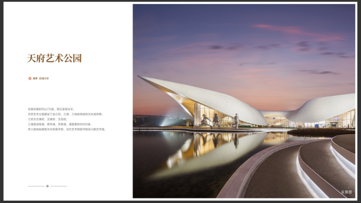 ——建筑美学理念:深度融入艺术公园的人文气场,以现代美学为基调,设计化繁为简,打造简约气质与高端材料相结合的现代雅致建筑,为公园城市的天际线贡献有一座美学地标。