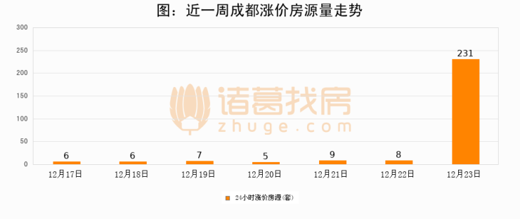 根据诸葛找房数据显示,成都24小时涨价房源量为231套,较12月22日增加223套,环比上涨2787.5%。与此同时,涨价房源占比小幅扩大,业主信心有所提升。