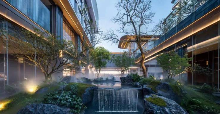 约600㎡飞瀑中庭构成社区景观灵魂,12米立体水帘与6米落水跌瀑形成动态水景序列。双重艺术水景营造出临水而居的自然秘境,浮桥、水边卡座与林中绿意共同构筑沉浸式度假体验。