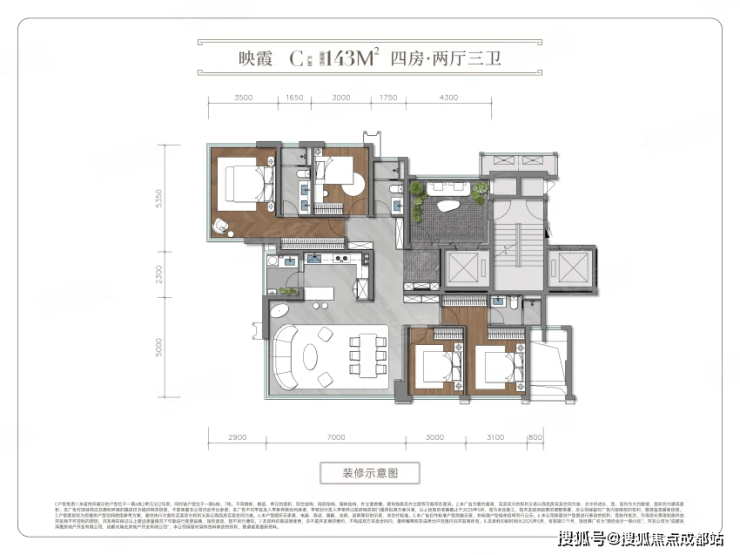 建面143㎡四室两厅三卫(进阶改善优选):得房率115%,对标主城160㎡产品尺度;双套房设计,主卧带独立衣帽间与卫生间,次卧配专属卫生间,化解多代同堂起居冲突;7.2米方厅+中西双厨,西厨可打造咖啡角、早餐台,适配现代家庭生活方式。