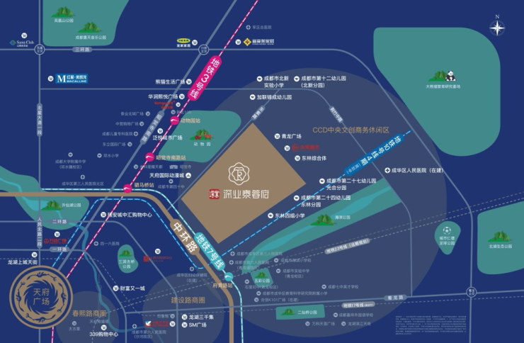 **交通**:深业泰蓉府交通十分便捷,距离地铁3号线动物园站直线距离仅900M,与7号线(府青路站、八里庄站)直线距离也仅1.2KM。主干道府青路连接市中心,贯穿一环、二环、中环和三环,无论是选择公共交通出行,还是驾车出行,都能在半小时内便捷通达全城。**商业**:项目周边商业配套成熟,泛悦城市广场、华润熙悦广场和青龙广场三大商业体强势组合,能够充分满足购物休闲消费需求。而且,项目自带约1.7万方的独立商业,一街之隔还有以东林综合体为主的社区商业,以及全国首创的天府国际动漫城,共同构建起全方位的日常所需商业覆盖。**医疗**:项目周边医疗资源丰富,拥有成华区人民医院(在建)、成华区城北医院、成华区第三人民医院、华西妇女儿童医院成华区分院(在建)等医疗机构,全方位守护业主的生活健康。**教育**:在教育配套方面,项目1公里范围内提供从幼儿园到高中的一站式教育资源。幼儿园有成都市第二十四幼儿园、成都市第二十七幼儿园;小学包括教育科研附属小学、海滨小学;中学有石室初中青龙校区、成都市实验中学等。